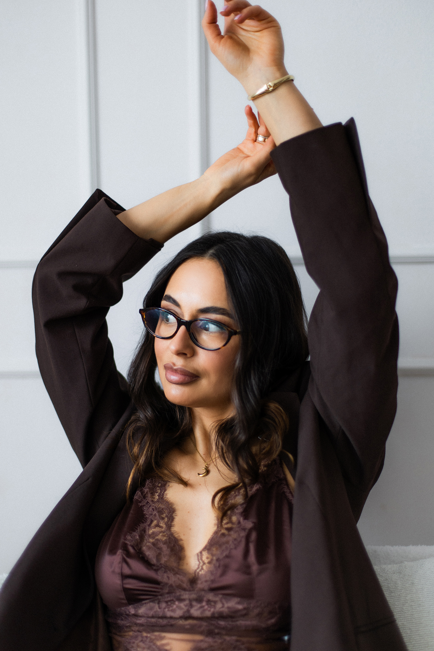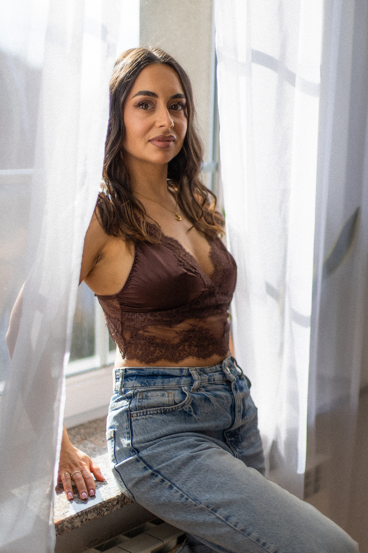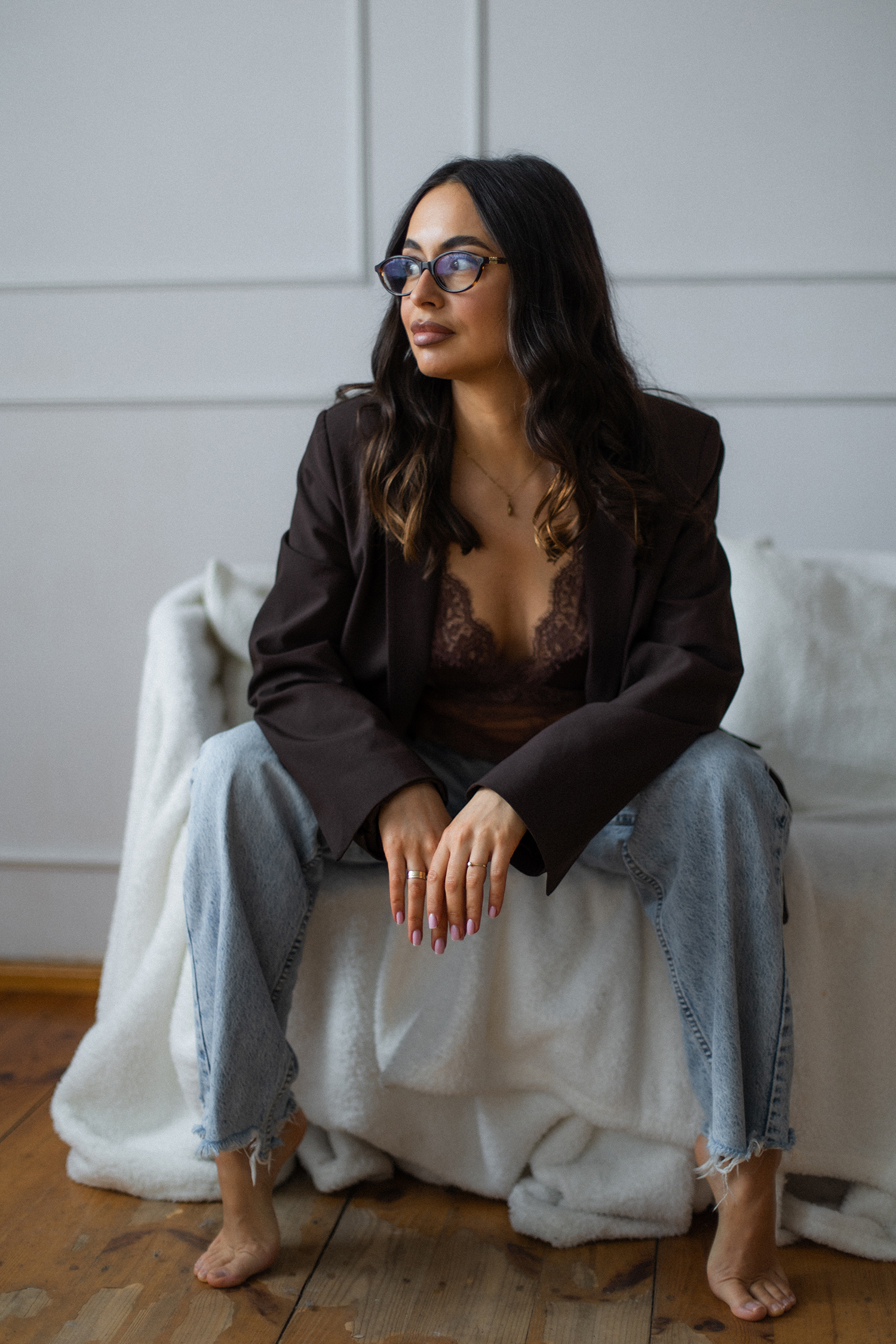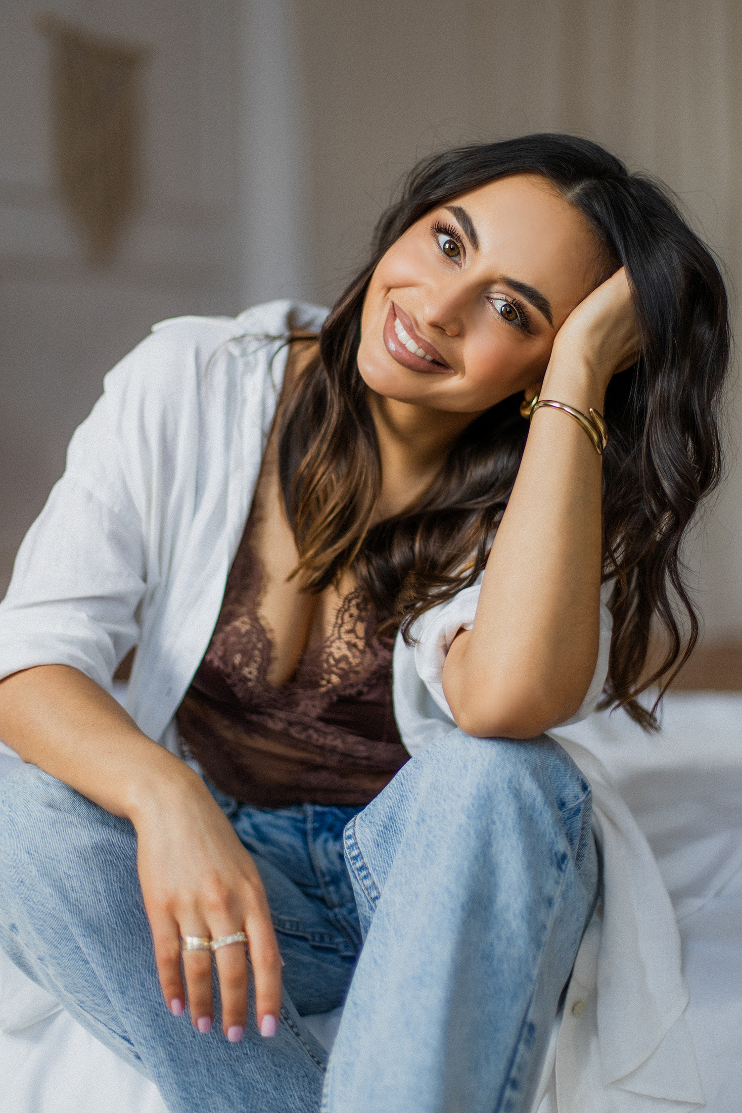 Podczas sesji postawiliśmy na delikatne, naturalne światło oraz minimalistyczne tło, które idealnie wydobywa charakter modelki. Profesjonalny makijaż i stylizacja dopełniły całość, tworząc spójną, elegancką opowieść w kadrach.