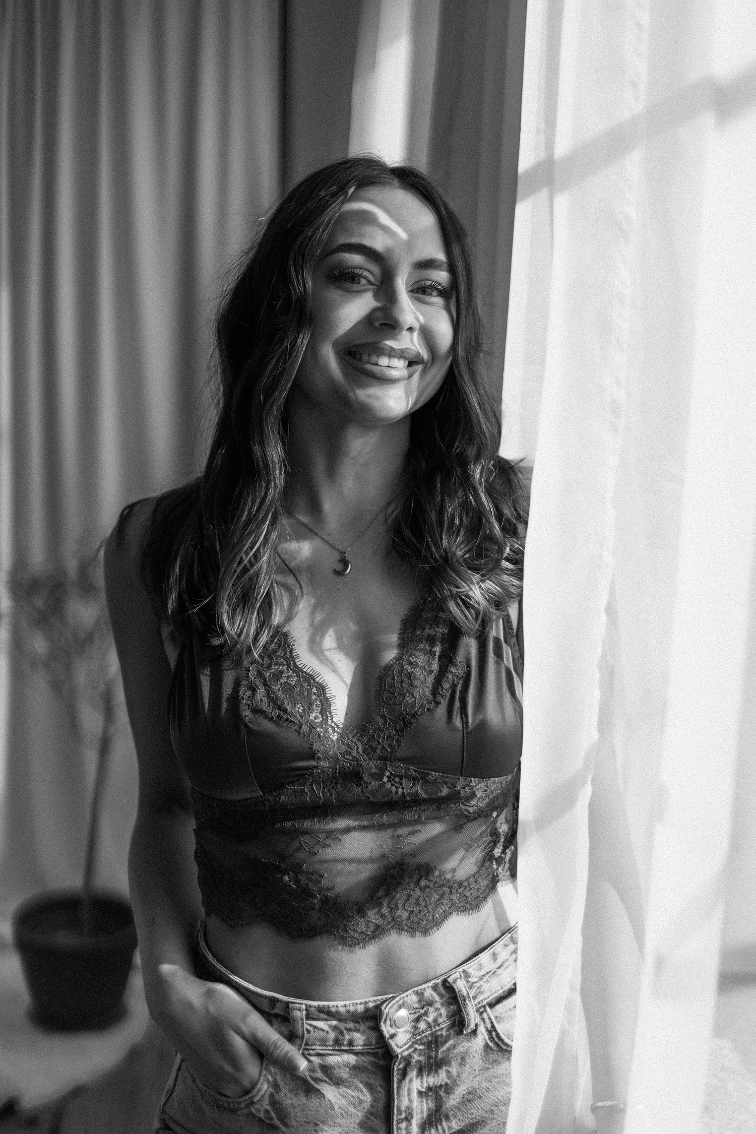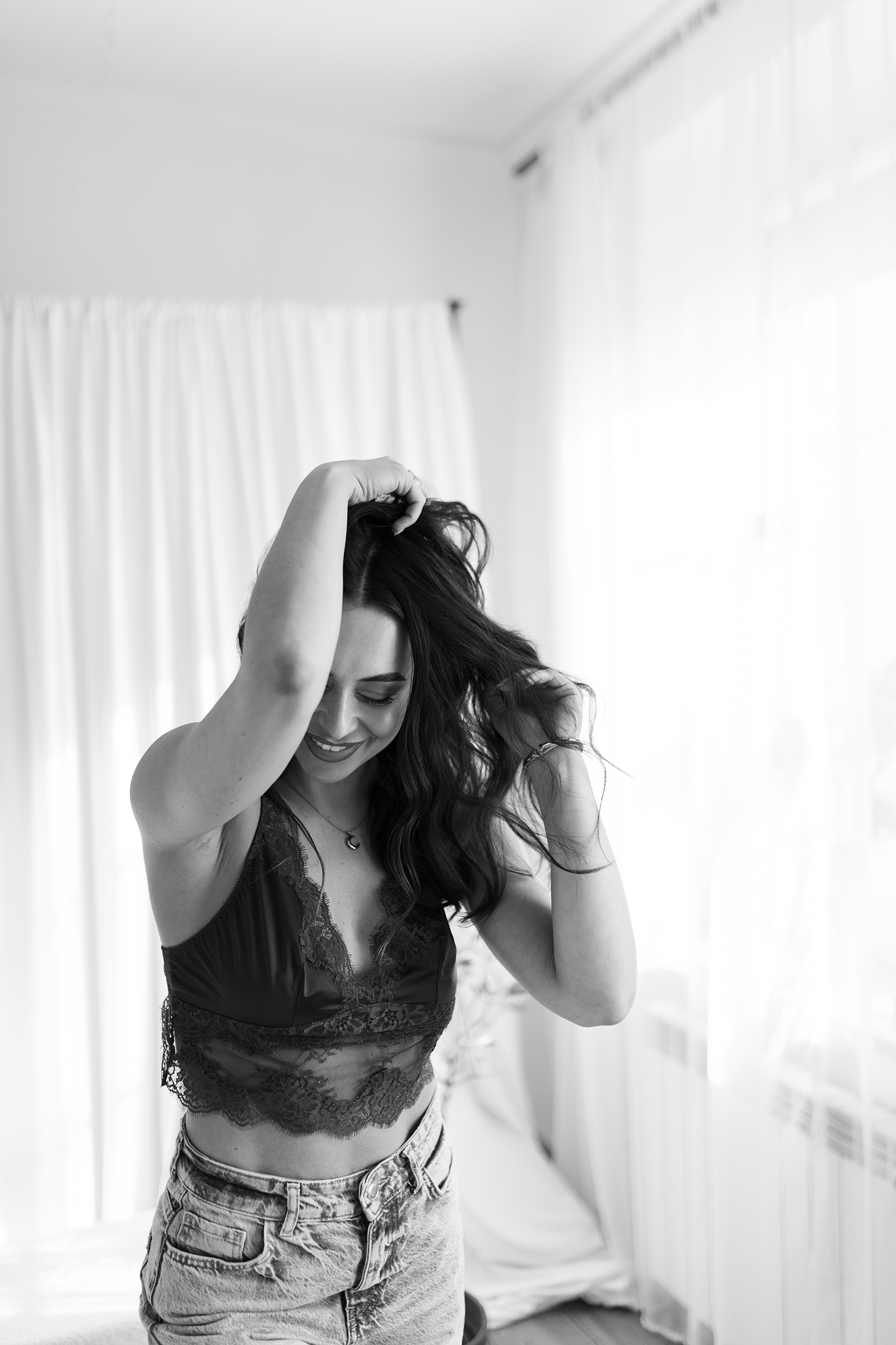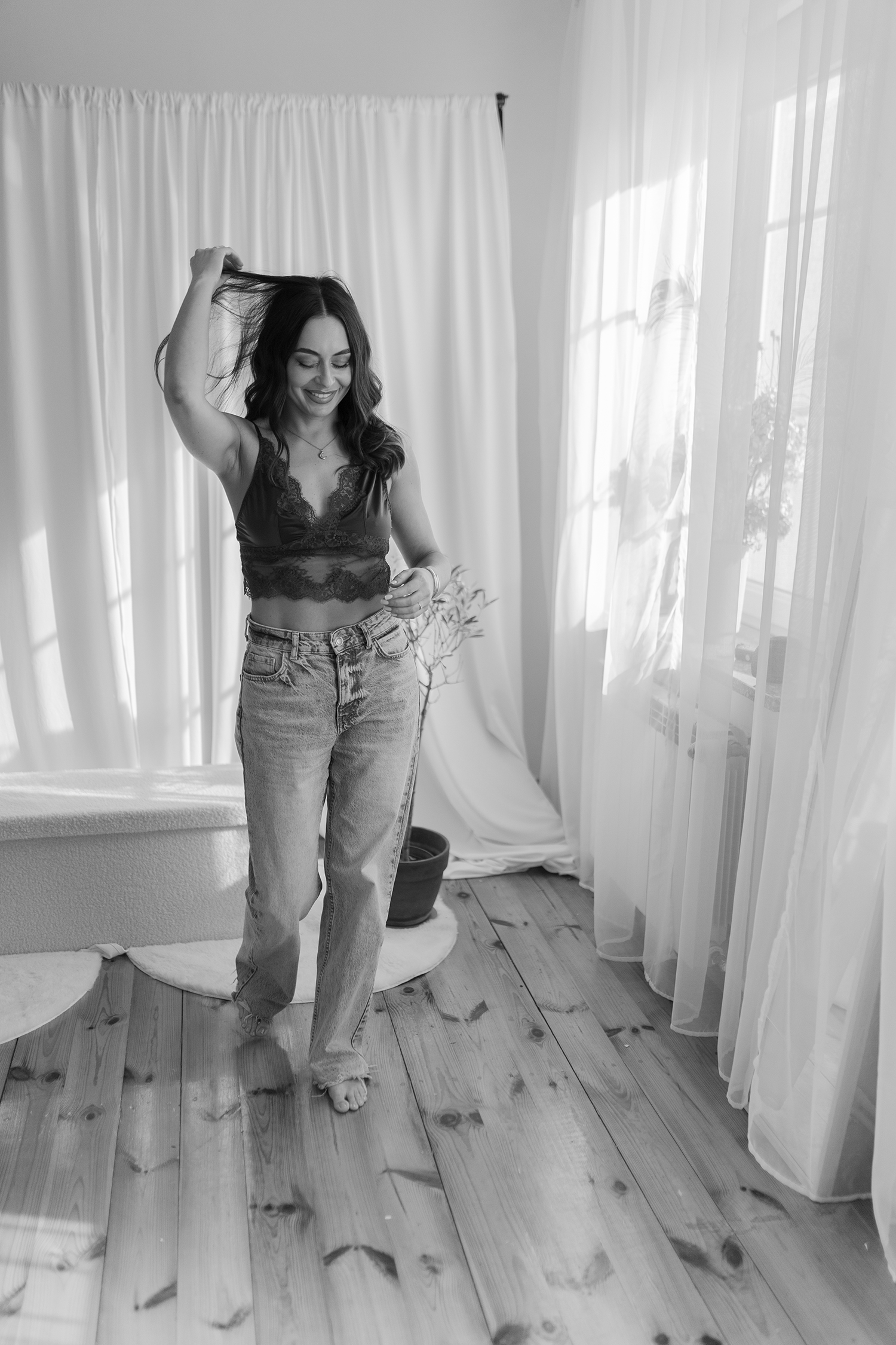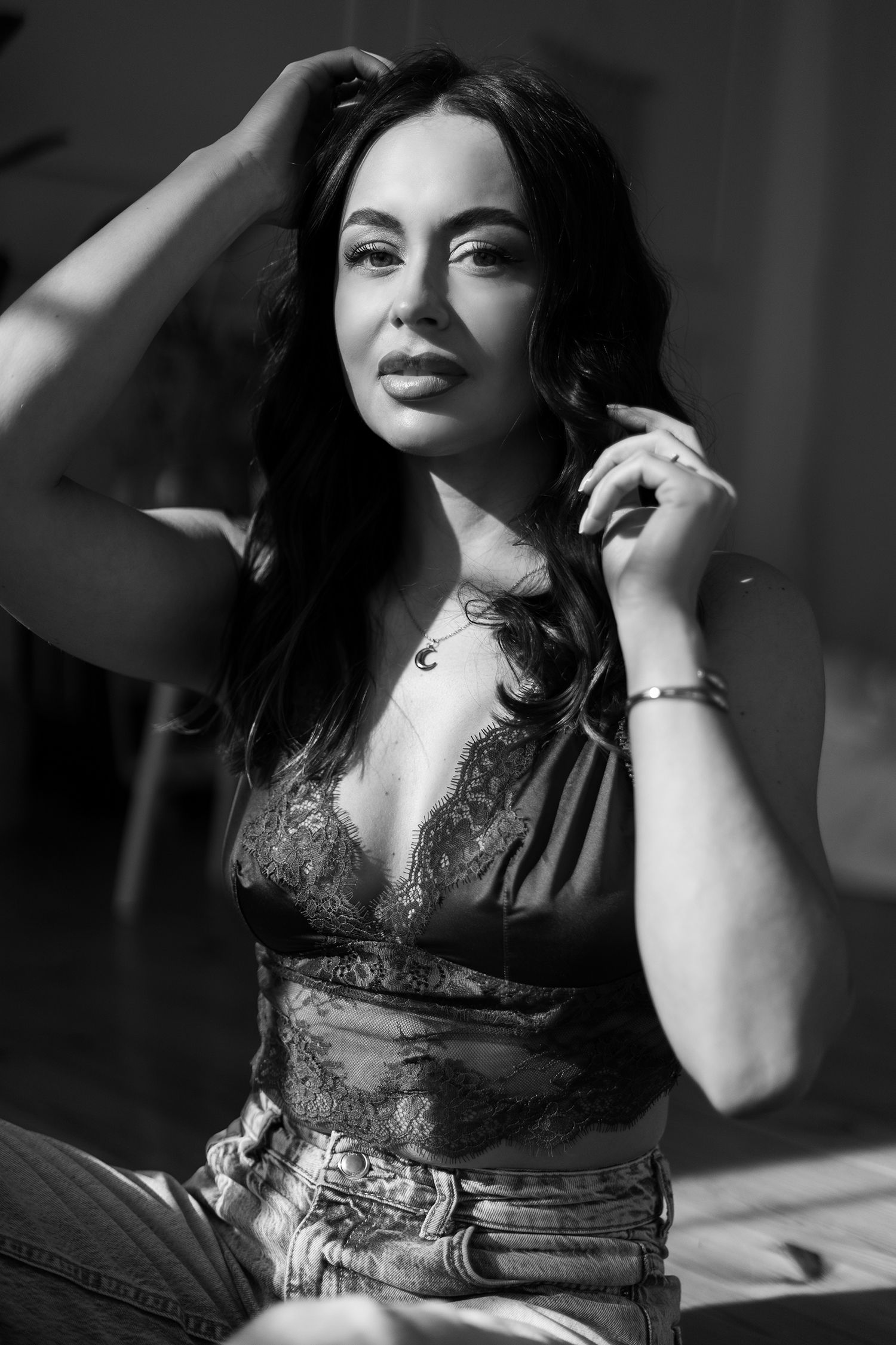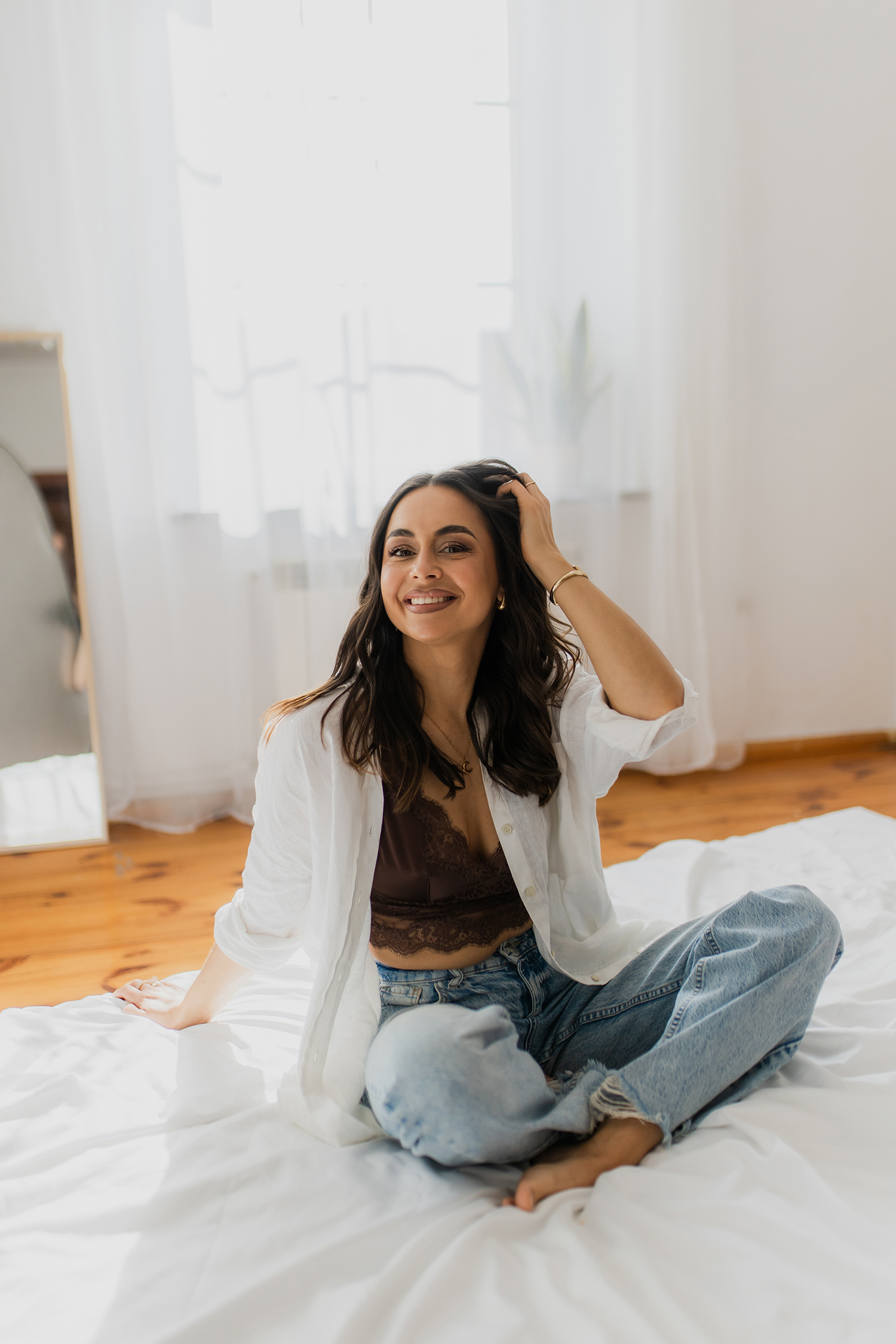 Spotkałyśmy się, by stworzyć coś kobiecego, sensualnego i autentycznego. Światło tego dnia było absolutnie wyjątkowe – miękkie, otulające, podkreślające każdy detal. Klaudia przed obiektywem wyglądała zjawiskowo – naturalna, pewna siebie, po prostu jak milion dolarów.